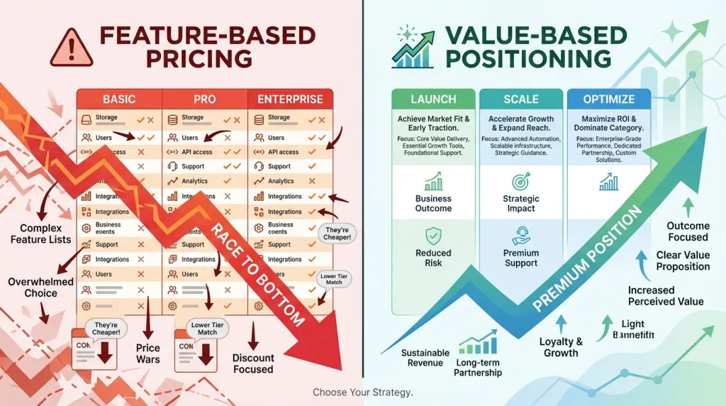 Lincoln Murphy, a customer success expert, emphasizes this: “Your product doesn’t have value. Your customer achieving their desired outcome has value.” This is the core of positioning-first pricing.